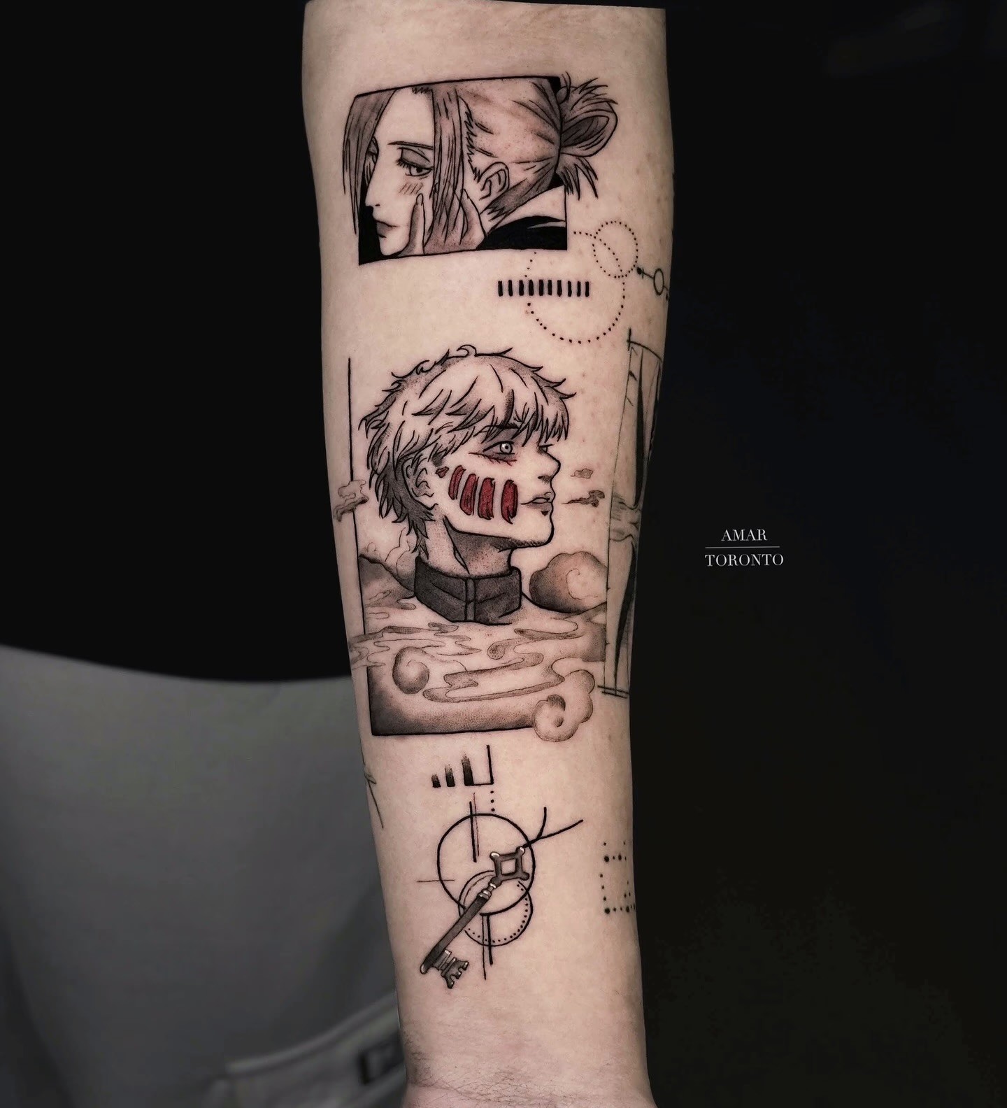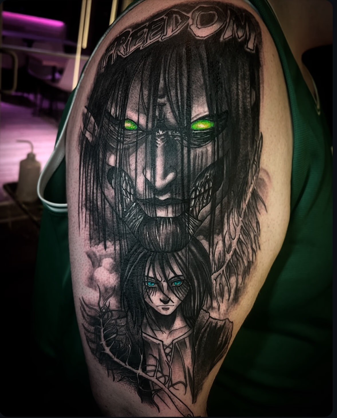 This tattoo captures Eren at the very end in his Founding Titan form, with his human self placed below as a reminder of where it all began. The contrast between the two versions of Eren says everything. A kid who wanted freedom and the man who decided how far he was willing to go to get it. The added parasite detail next to Eren is a subtle but smart nod to the power that changed everything!